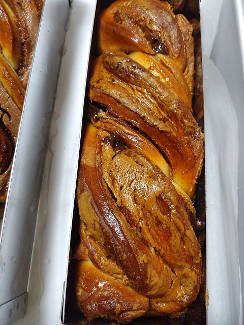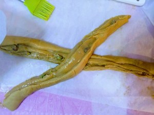 נלפף את הרצועות אחת על השניה כמו בורג- ראו תמונה, נניח את העוגה ברינג מלבני/בתבנית אינגליש קייק ונכווץ או נרחיב את העוגה כך שתתאים לתבנית