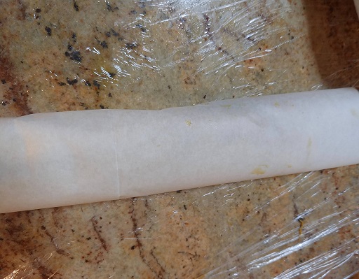 נוציא את הגליל הראשון מהמקפיא ומנייר האפייה ונעביר למשטח העבודה