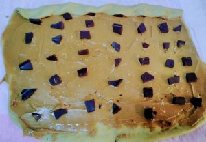 נמרח את ממרח הלוטוס כך שיכסה את פני הבצק מלבד פס לרוחב בחלקו התחתון של המלבן בעובי של כ -2 ס"מ כמו בתמונה. נפזר מלח גס באופן אחיד, ולאחר מכן את קוביות השוקולד גם כן באופן אחיד