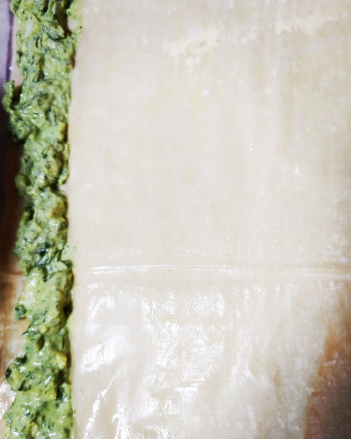 נפרוס על משטח עבודה נקי את עלי הפילו(לאורך), ונבריש את פני העלה העליון בשמן זית, כך שכולו יהיה מצופה שמן. נניח באמצעות כפית את המלית לאורך העלה בצדו השמאלי בלבד, כפס בעובי 2 ס"מ מלמטה למעלה (ראו תמונה בהמשך)