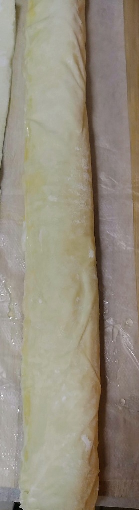 נרים קצת את הקצה התחתון של העלה שעליו אנו עובדים, יחד עם העלה שמתחתיו(כל בורקס מורכב מ-2 עלי בצק), ונתחיל לגלגל בעדינות לגליל משמאל לימין. נעצור 2 ס"מ לפני הסוף, נמרח את הס"מ שלא גולגל בשמן זית וגם את הגליל מבחוץ, נשלים גלגול. נצפה את הגליל בשמן זית מכל הכיוונים (מבחוץ).