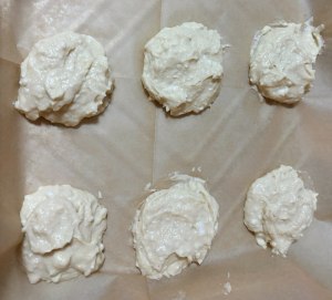 ניצוק בעזרת כף עיגולים מהבלילה לתבנית (כל מאפה כ-1.5 כפות), עם רווחים בינהם ונשטח כל מאפה עם הכף